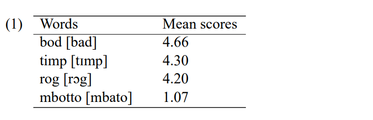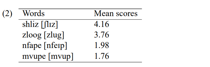 | Native speakers' intuitions about possible and impossible words are heavily influenced by the phonological properties of sound sequences, represented by relative differences in sonority, i.e., how resonant one sound is compared to the other. A group of English native speakers were asked to decide how each of the following nonsense words sounds to them, and to give each word a numerical rating, from '1' to '5', according to how confident the respondents are that those are Englih-like words, '1' meant that the word is definitely not English-like, and '5' meant that it can definitely be an English word. Their averaged ratings for the words are shown in (1). ![]() It appears that native speakers of English perceive words with simple onset to be more English-like than those with complex onset, and simply reject words that violate the phonotactics in English. However, the presence of onset clusters and legitimate phonotactics do not fully explain how the speakers' intuition work. Another group of English native speakers were asked to do the same task for a different set of nonsense words, as illustrated in (2). ![]() |