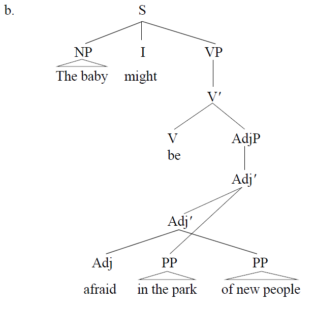 | A sentence sometimes allows for more than one reading when a modifier has more than one option to take. For instance, in (1) the PP in France may modify a verb to derive the meaning of "I went to France where a seminar on language took place," or a noun to derive the meaning of "The seminar was about language in France." (1) I went to a seminar on language in France. In syntax, branches are now allowed to cross in tree structure, which is also known as the No Crossing Branches(NCB) constraint. Observe that sentence (2a) is ruled out, and its ungrammaticality is attributed to a violation of the NCB constraint, as shown in (2b). (2) a. *The baby might be afraid in the park of new people. ![]() |