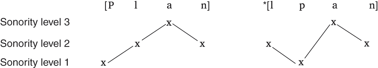 in English, the words witih (1)simple onset and (2)complex onset have sonority increasing gradually towards the nucleus of the syllable.