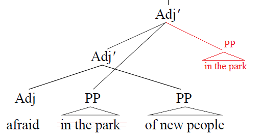 ➜ ᵖᵖ[in the park] 는 Adjunct인데 ᴴᵉᵃᵈ[afraid] 랑 ᶜᵖᵗ[of new people] 사이에 끼어있음. 그래서 비문임. ➜ its ungrammaticality is attributed to a violation of the No Crossing Branches(NCB) constraint. ![]() |