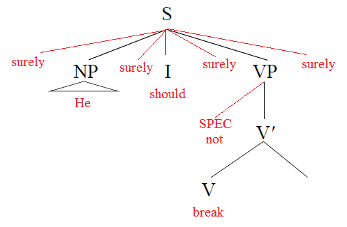 - Second, in (4a), in tree diagrams the sentence adverb 'surely' which adjoins to the S node cannot occur between the word 'not' which merges at SpecVP and the V-bar 'break his promise'; the adverb 'surely' ends up crossing the VP branch to adjoin to the S node, violating the NCB constraint.