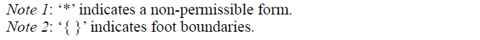 | 'Foot' is sa prosodic unit above syllable, which consists of one obligatory strong syllable and optional weak syllables. Feet seem to have many different structures in English. For example, there are feet composed of a single stressed syllable (e.g., {ˈson}) and feet where a stressed syllable is followed by one stressless syllable (e.g., {ˈmother}) or by two or more stressless syllables (e.g., {ˈCanada}). Sometimes, a strong syllalbe appears in the second (e.g., {deˈmand}, {baˈnana}). Foot structure can change due to [ə]-deletion. First, the data in (1) show that [ə] in an initial stressless syllable can be deleted in fast speech. (1) Normal speech Fast speech a. Toronto [tʰəˈrantoʊ] [ˈtr˳antoʊ] b. Marina [məˈrinə] [ˈmrinə] Second, the datat in (2) demonstrate that [ə] in a medial stressless syllable can be deleted after a stressed and before a stressless syllable in fast speech. (2) Normal speech Fast speech a. opera [ˈapərə] [ˈaprə] b. general [ˈʤɛnərəl] [ˈʤɛnrəl] Third, the data in (3) tell us that when two stressless syllables occur between two stressed syllables, [ə] in either stressleses syllable can be deleted in fast speech. (3) Normal speech Fast speech a. respiratory [ˈrɛspərəˌtʰɔri] [ˈrɛsprəˌtʰɔri] b. glorification [ˌglɔrəfəˈkʰeɪʃən] [ˌglɔrfəˈkʰeɪʃən] or [ˌglɔrəf ˈkʰeɪʃən] However, [ə]-deletion cannot occur even in fast speech when a stressless syllable occurs directly between two stressed syllalbes as in (4). (4) Normal speech Fast speech a. operatic [ˌapəˈræɾɪk] [ˌapəˈræɾɪk], *[ˌapˈræɾɪk] b. generality [ˌʤɛnəˈræləɾi] [ˌʤɛnəˈræləɾi], *[ˌʤɛnˈræləɾi] |