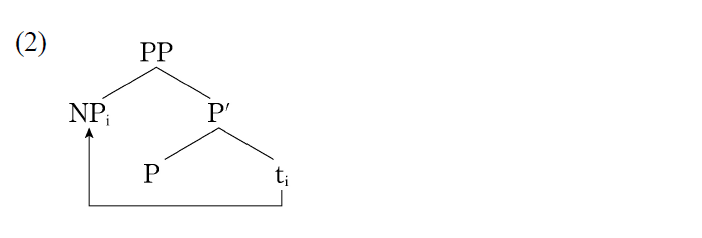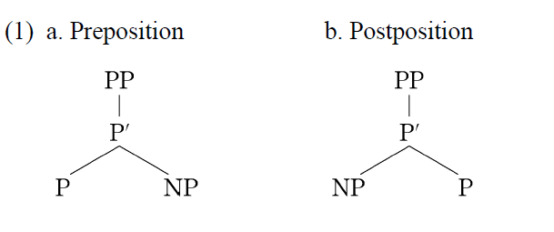 In the languages of the world, we have tewo different types of adposition: a preposition type (e.g., English) and a postposition type (e.g., Korean). With the preposition type, we find that a preposition head precedes its complement as in (1a). As for the postposition type, a postposition follows its complement as in (1b). ![]() However, some linguists argue that all languages uniformaly have the preposition system and the seemingly postposition system is derived from the preposition type by movement as in (2). ![]() We can apply the analysis in (2) to the so-called particle structure. (3) They left [ᴾᴾ [ᴺᴾ this part]ᵢ out tᵢ]. In (3), NP this part moves from the _____ position of the ehad out to the specifier position. |