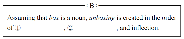 - Based on <A>, fill in each blank in <B> with an appropriate morphological process from (1). Write your answers in the correct order.
