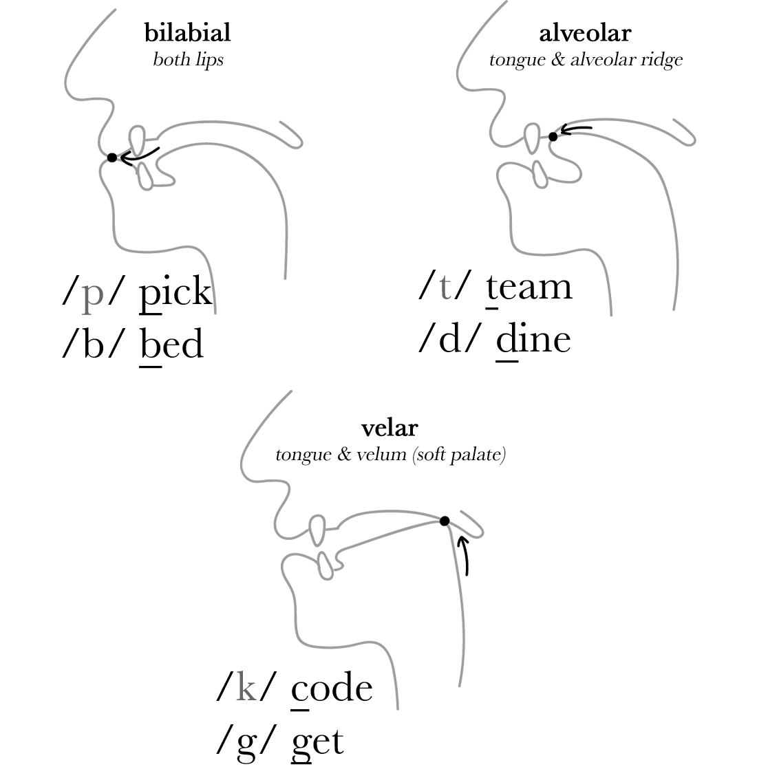 ➜ /old mæn/ /ækts/ /kloðz/ /mɅnθes/ ➜ d, t - 📍 plosive=stops(manner), alveolars(place) ð,θ - fricative(manner), interdentals(place) ![]() ➜ 📍 fortis/lenis (voiceless/voiced) distinction. ➜ fortis plosives 뒤, stressed syllable 앞에서 elision되면서 pʰte.to 2음절+aspration 이 일어남. ➜ plosives (= stop stounds) ➜ 모음이 사라지고 남은 공백은 aspiration으로 채워져. |