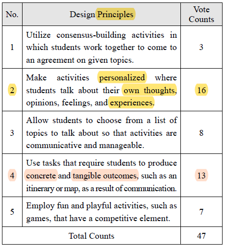 Principle No. 2 is applied in Activity 1, which requires students to talk about their personal experiences about their life at the age of ten based on given questions. On the other hand, Principle No. 4 is utilized in Activity 3, which requires students to produce a concrete and tangible outcome, by completing ‘Daniel’s class schedule’. *여기서 tangible outcome은 worksheet을 말하는건가? |
