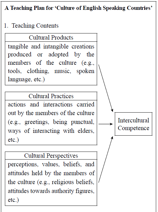 This semester, Ms. Kang, ⋯⋯ to teach a new elective course called the 'Culture of English SPeaking Countries'. The goal of the course is to help students develop intercultural competence. She consulted multiple resources including ⋯⋯. Based on her research, she has come up with the teaching plan presented below.![]() 2. Teaching principles 1) Integrate language skills and culture. 2) Utilize different types of audiovisual aids. 3) Avoid reinforcing associations between nationalities(countreis) and cultures. 4) Involve students in discovering English culture instead of transmitting information 5) Assess students' achievements based on their performances at the end of the lesson. |