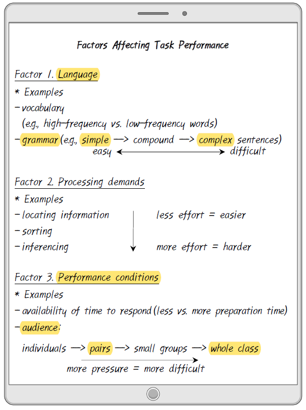 Mr. Kim, ⋯⋯ he learned that a variety of factors impact a learner's task performance which he could manipulate to adjust the level of task difficulty. One is language of input that learners have to process, such as the range and complexity of vocabulary and grammar. Another factor has to do with the processing demands of a task, which refer to the amount of mental effort required in working out answers. Besides these two factors, the conditions under which a task is performed also play an important role. Below are the notes he took during the workshop. ![]() |