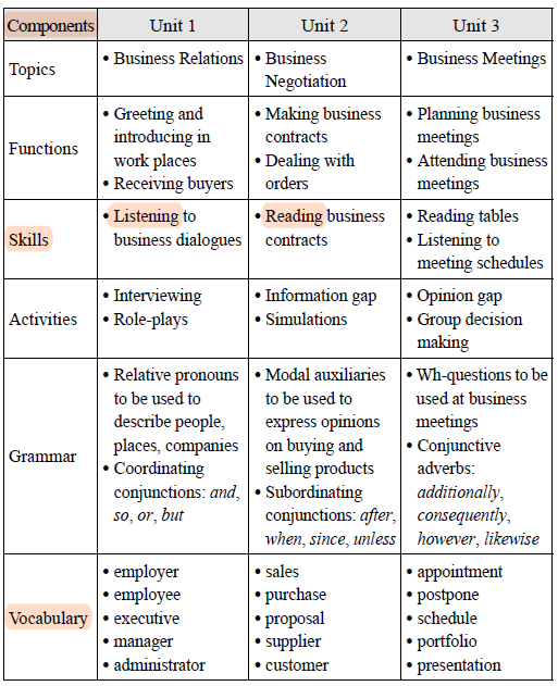 ➜ Skills and Vocabulary do not correspond to the teacehrs' ideas about their syllabus. ➜As for Skills, receptive skill만 다룬다 instead of dealing both skills. whereas for vocabulary, only focus on single words such as employer or sales instead of multi-word units like collocations, idioms, and fixed expressions. |
