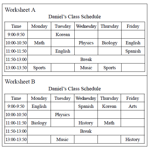 [Activity2] Work in pairs. Each studetnt receives a different card. Ask questions to each other in turn about the things on your card. ![]() [Activity 3] Work in piars. Each studet receives either Worksheet A or Worksheet B. Talk with your partner to complete Daniel's class schedule using the example dialogue below. Example -