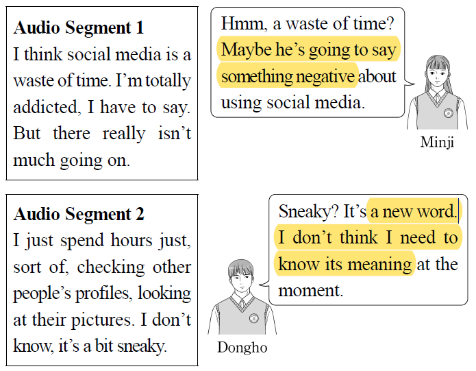 Identify the ONE specific listening strategy from each type in <A> that Minji and Dongho applied to their listening process in <B>, respectively. ➜ Minji applies Type2 global strategy while Dongho applies Type1 local strategy. making predictions about the content based on phrasal cues 'a waste of time' which shows some negative aspects of using social media. While Dongho determines to skip the unknown word 'sneaky'. |